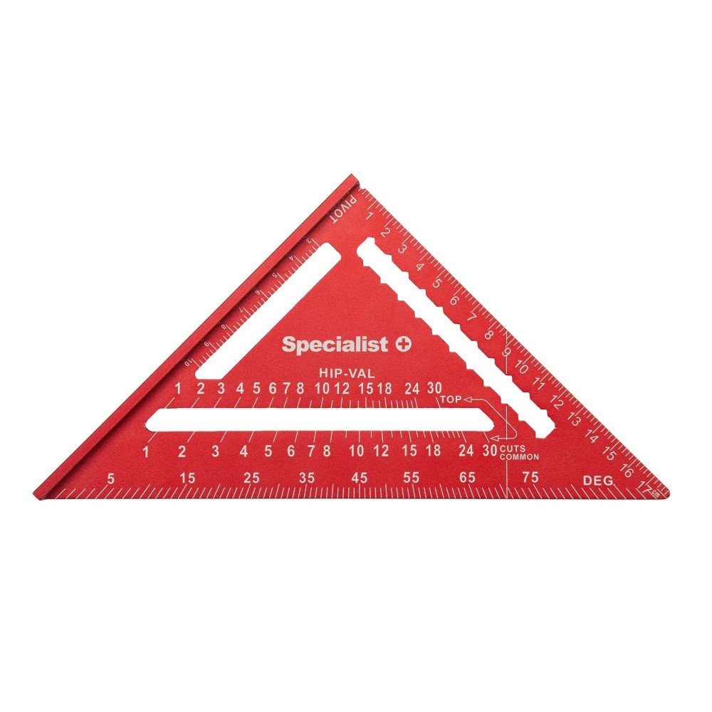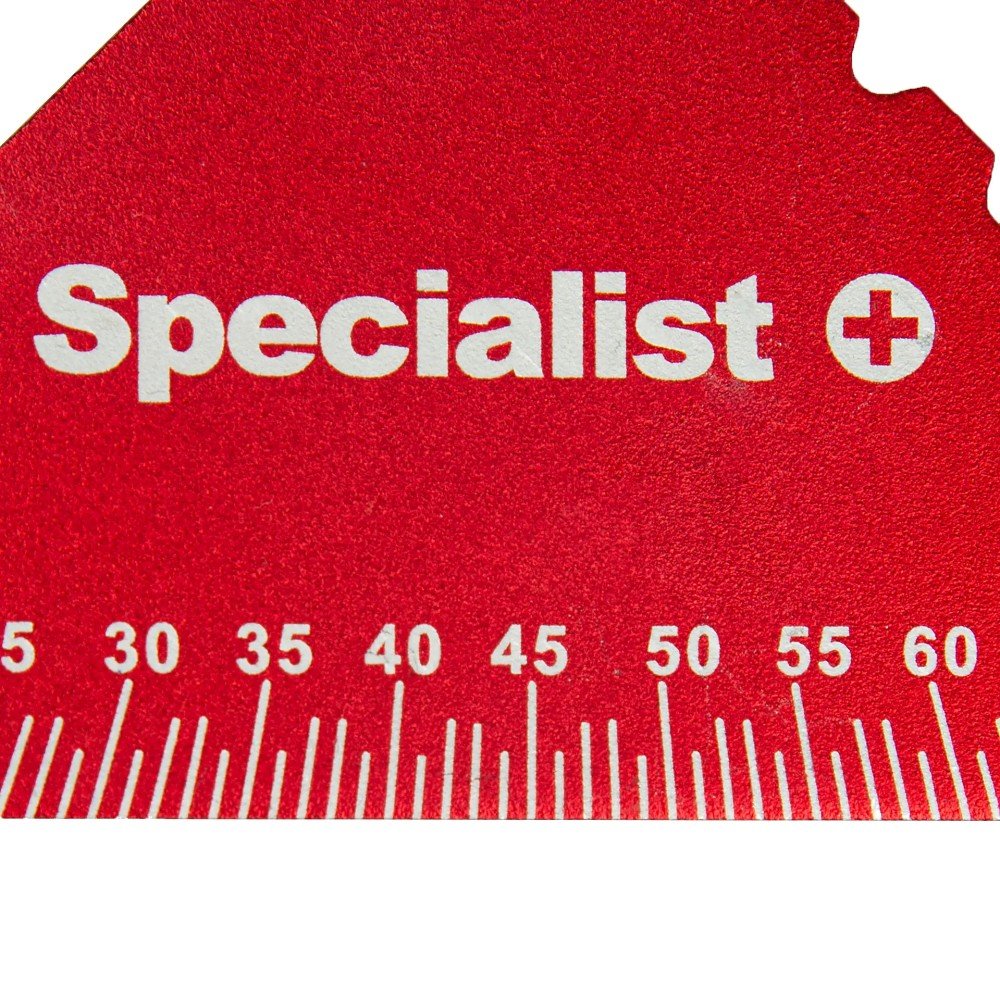 Aukštos kokybės Specialist+ matavimo trikampis, pagamintas iš tvirto anoduoto aliuminio, užtikrinančio ilgaamžiškumą ir atsparumą korozijai. Raudona anoduota spalva pagerina matomumą darbo vietoje, o lazeriu išgraviruota skalė ir skaičiai garantuoja ilgaamžį žymėjimą, kuris nenusitrina net intensyviai naudojant. Naudojama metrinė skalė (mm/cm).